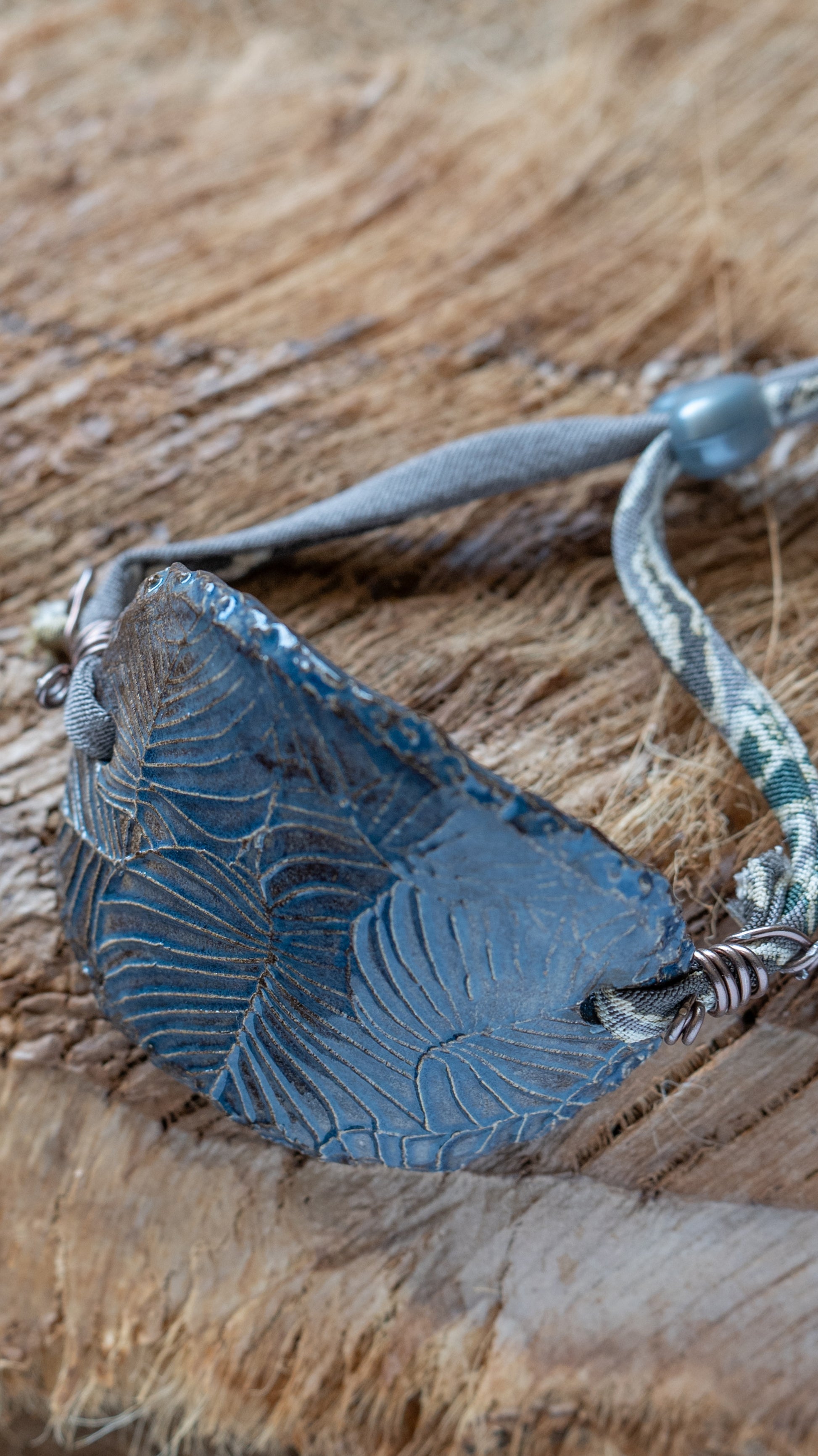 Monstera Ceramic Bracelet Cuff – Dark Brown with Blue Hues Glaze & Adjustable Repurposed Kimono Cord